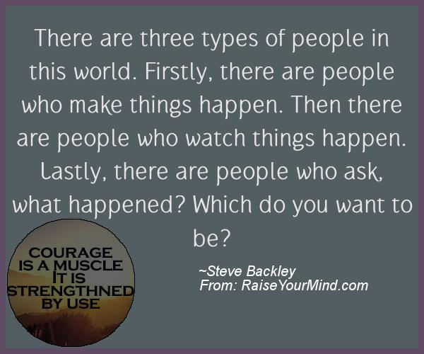 There are three types of people in this world. Firstly, there are people who make things happen. Then there are people who watch things happen. Lastly, there are people who ask, what happened? Which do you want to be? A nice motivational quote from Steve Backley 19 June 2016 In Motivational & Inspirational Quotes inspirational motivational persistence Steve Backley ← Previous post Next post →