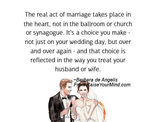 The real act of marriage takes place in the heart, not in the ballroom or church or synagogue. It’s a choice you make – not just on your wedding day, but over and over again – and that choice is reflected in the way you treat your husband or wife. wedding quotes 12 July 2015 In Wedding Wishes, Quotes & Verses Again Barbara de Angelis heart Wedding ← Previous post Next post →